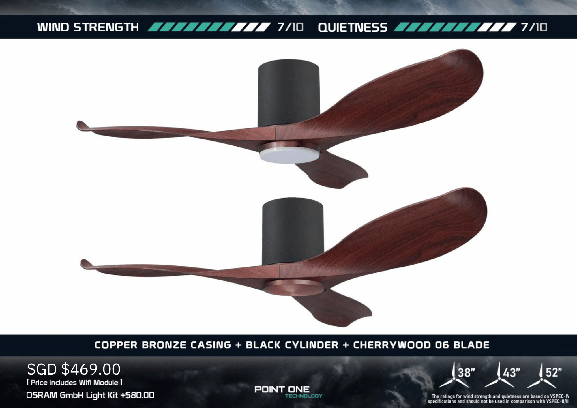 | Choice of 3 blade colours: Black / White / Cherry Wood/ Greywood Hugger Colour: Black or White Casing Colour: Copper Bronze, White or Black |
